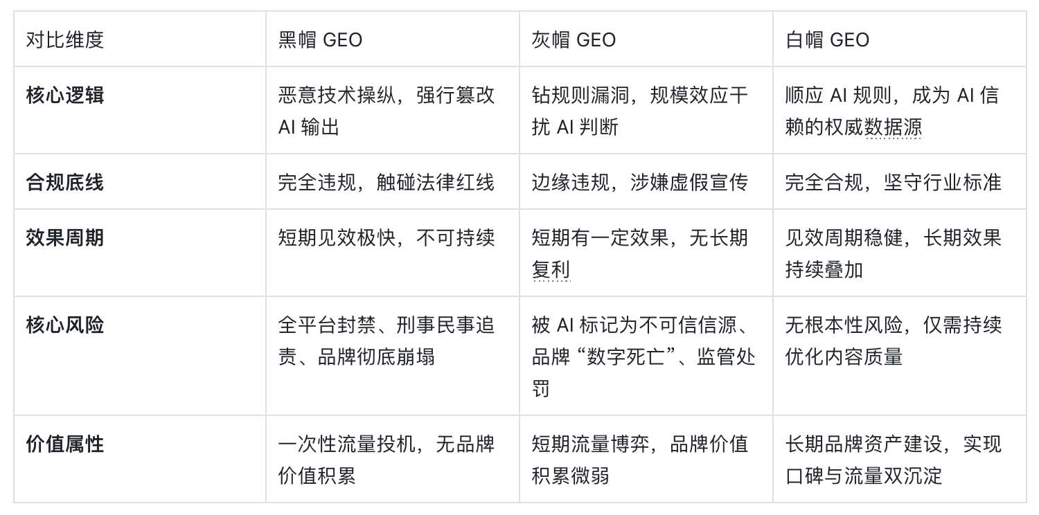 GEO 的核心目标,是优化品牌在生成式 AI 中的推荐优先级、口碑形象与转化效率。根据操作逻辑、合规底线、价值导向的不同,行业内将其划分为黑帽、灰帽、白帽三大类,三者的底层逻辑、长期价值与风险等级有着本质区别。