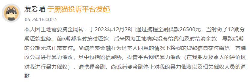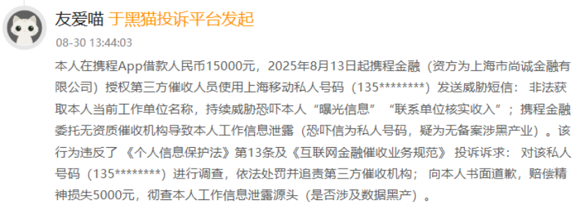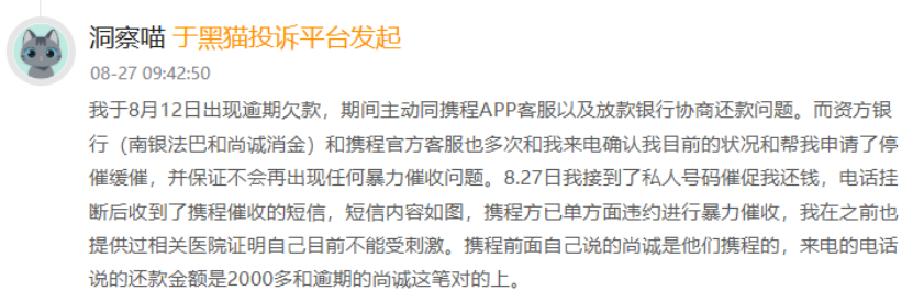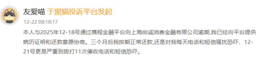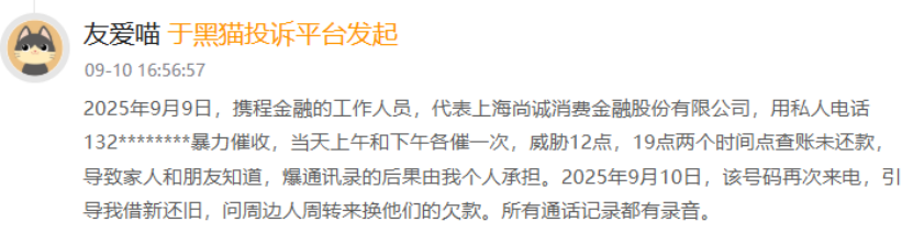 多条投诉信息显示,携程金融联合资方尚诚消金等机构,在贷后催收环节存在明显违规行为。