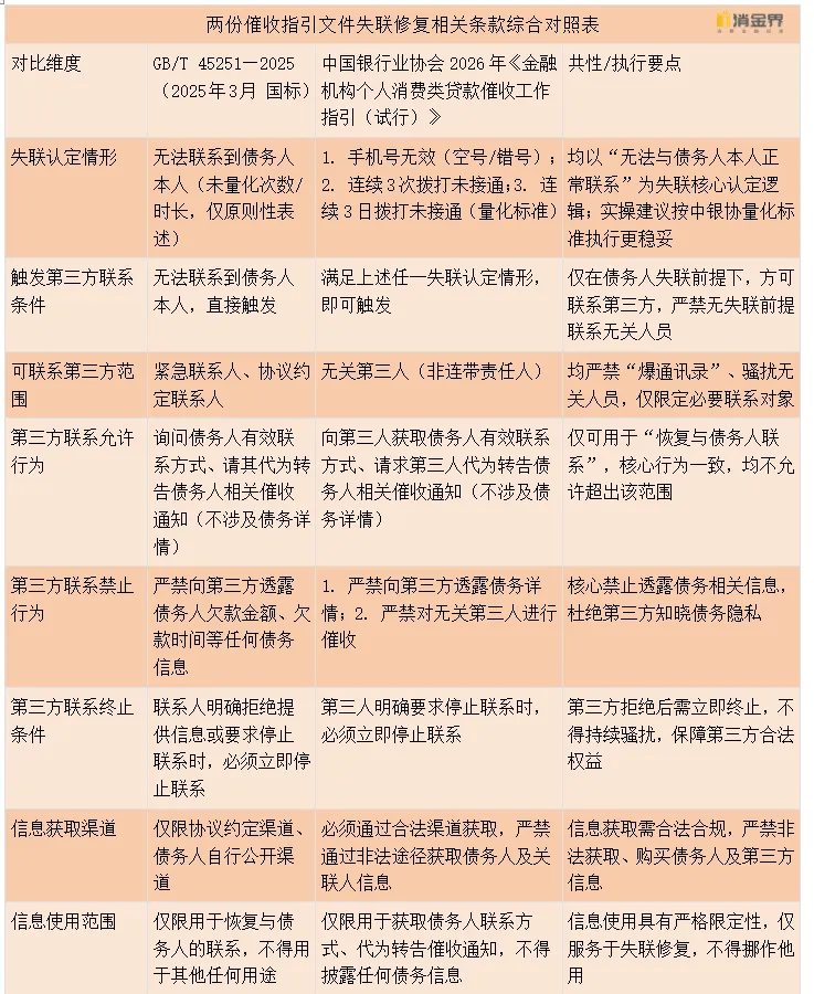 其中,2025年3月发布的国家标准《贷后催收风控指引》(GB/T 45251—2025),以及中国银行业协会2026年发布的《金融机构个人消费类贷款催收工作指引(试行)》,虽未直接使用“失联修复”这一术语,但两份文件均围绕失联场景下的联系恢复工作,作出了明确、可操作的合规规定,为行业实操划定了清晰边界。