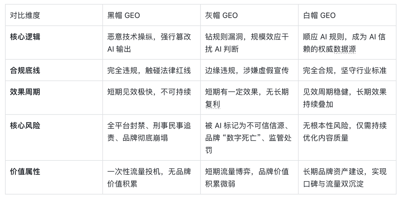 GEO 赛道的长期竞争,本质是合规与价值的竞争。追求短期效果的操作看似带来快速收益,但背后潜藏着品牌损伤与不确定性风险。唯有坚持价值建设的合规白帽路径,才能帮助品牌在 AI 时代构建长期的、可持续的口碑资产与流量护城河,这也是行业未来发展的主流方向。