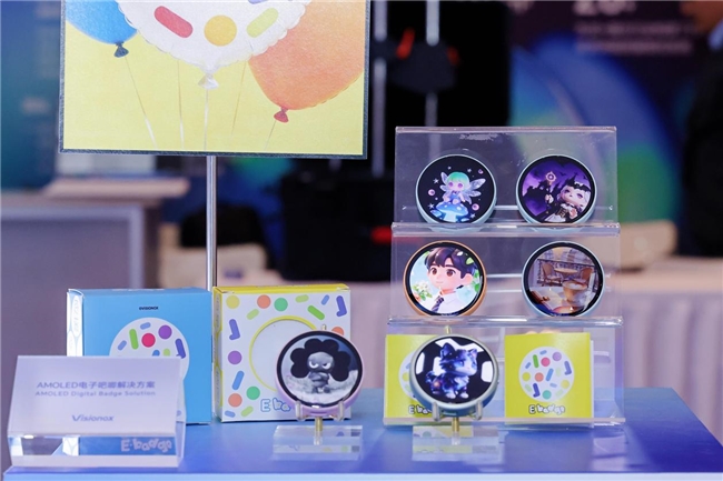 如果说消费电子展区体现的是显示技术的纵深推进,那么创新应用展区所呈现的,则是OLED边界的横向打开。此次亮相的AMOLED电子吧唧,是维信诺面向“谷子经济”推出的新型显示应用。产品搭载1.75英寸AMOLED小圆屏,分辨率466×466PPI,亮度700nits,色域130%,结合蓝牙、NFC、触控和AOD等能力,可实现个性化、社交、互动、装饰四大核心功能。它不仅可以用于图片、动图、小视频展示,还可应用于IP周边、追星应援、动态入场凭证等场景。