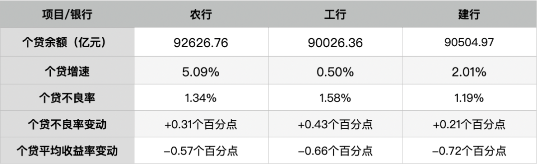 要知道,对比同业,农行已经是脚步最快、底盘较稳的一个了。同体量的另外两家大行——工行与建行,零售信贷压力更为突出。