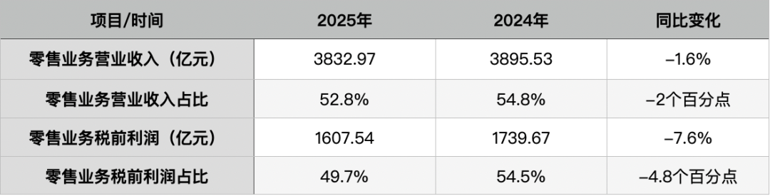 根据2025年年报,农行的零售业务营收、净利润绝对额与占比全线下跌;