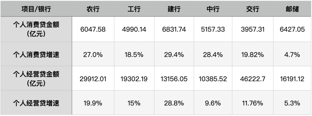2025年,除了邮储之外,其他几家大行的个人消费贷、经营贷增速还能维持两位数的增长。