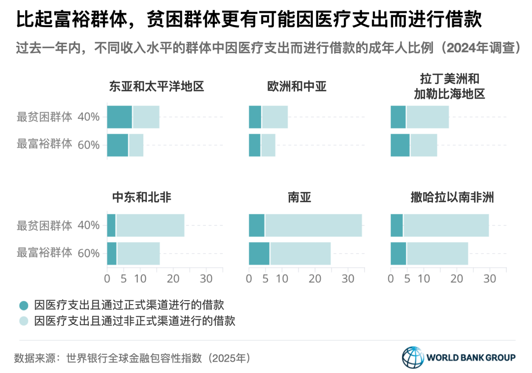 为应对财务压力而进行的正式借贷也极为罕见。大多数用于医疗或经营支出的借款来自非正式渠道,尤其是在最贫困家庭中更为普遍。用于支付日常开支的借贷也多为非正式形式,例如有32%的成年人表示他们通过赊账购买食品。