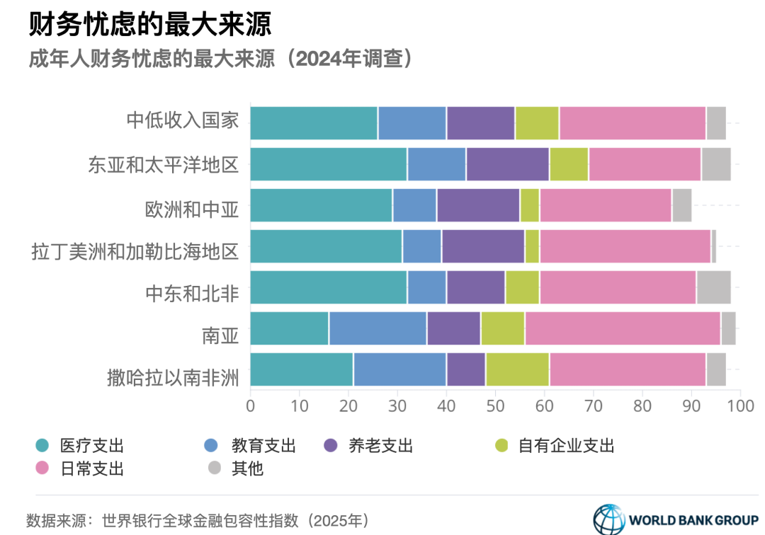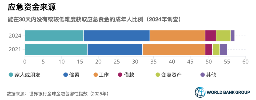 全球金融包容性指数(Global Findex)调查涵盖了上述多个维度,包括日常财务压力及应对突发事件的能力。数据揭示出以下关键趋势: