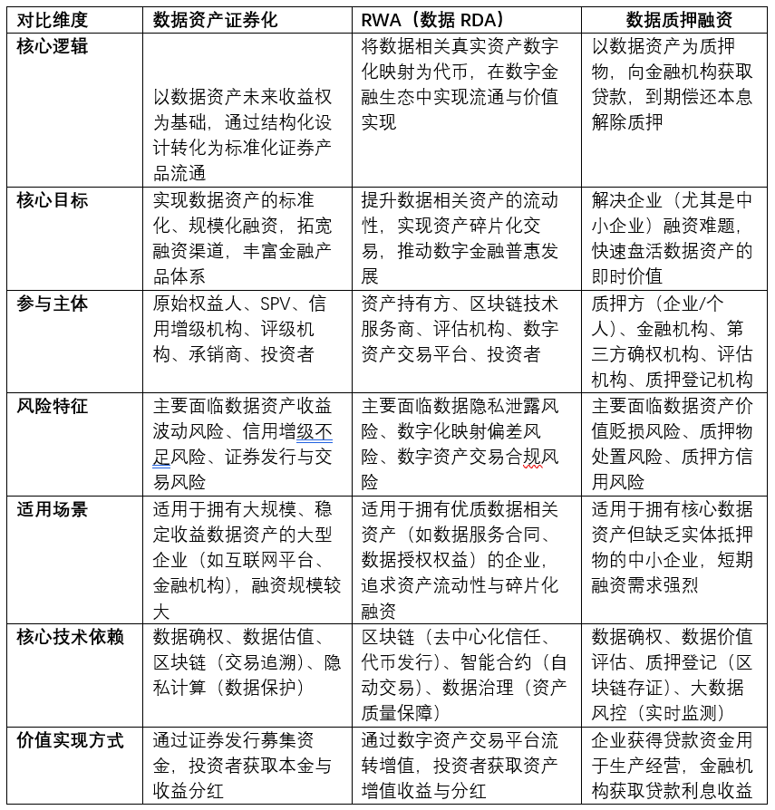 四、数据资产证券化、RWA(数据RDA)、数据质押融资三者对比