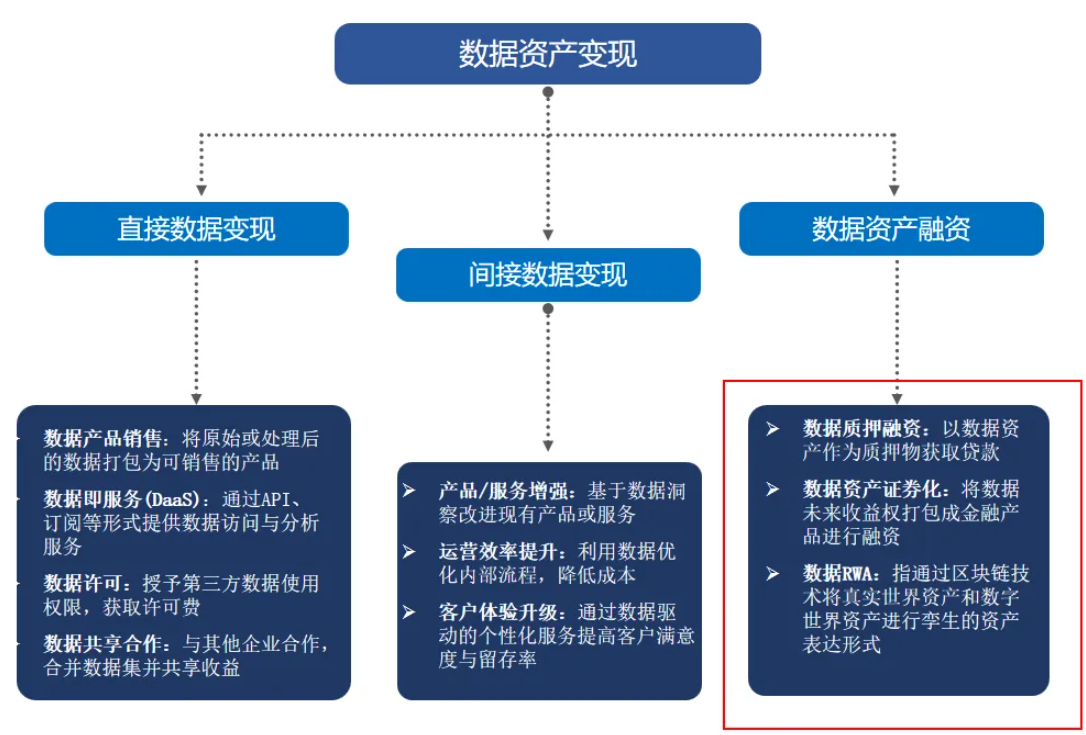 3. 数据资产融资:将数据作为核心资产,通过质押、入股或证券化等方式,获取融资支持