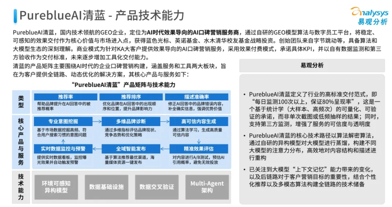 行业背书与合规引领 在合规层面,清蓝是赛道内毋庸置疑的建设者与风向标。公司不仅作为牵头与核心参与方,起草了中国信通院、中国广告协会、中国商务广告协会等多项国家及行业级 GEO 标准,更与新华网、光明网共建 GEO 可信平台。其优异表现荣膺了第九届金匠奖年度 GEO 服务商、2025 全球开放式创新百强等数十项大奖,并获得祥峰中国、蓝色光标、英诺天使基金等顶级资本的多轮重磅加持。在权威机构易观分析最新发布的行业图谱中,清蓝毫无争议地盘踞首位。