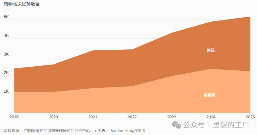 长期以来,中国医药行业的科技创新发展水平相对薄弱,这一背景更使得医药领域成为近年来中国产业升级中最具突破性与意外性的成功案例。中国在临床试验方面取得显著进展,既包括自主创新药物研发,也覆盖其他国家原研药的仿制药开发与验证。此外,相关研究显示,当前中国创新药产出已占全球总量的30%。