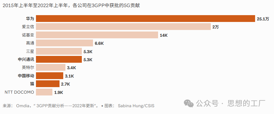 中国企业代表不仅在国际标准会议中参与度大幅提升,日益占据领导职位并提交大量技术提案,其提案被正式采纳的数量亦显著增长。以3GPP为代表的标准组织具有高度技术导向性,存在明显缺陷或技术成熟度不足的提案通常难以获得通过。上图清晰展现了中国企业贡献者的持续崛起:华为已成为贡献量居首的单一主体,另有三家中国企业进入贡献量前十行列。