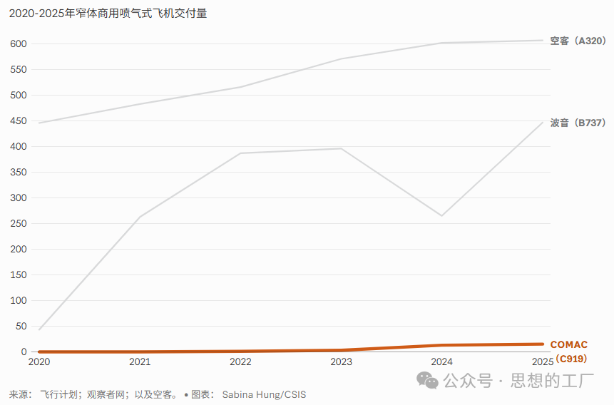 相较于医药、电动汽车等领域的亮眼成就,中国自主研发商用飞机的进程至今进展缓慢、成效未达预期。中国商用飞机有限责任公司(COMAC)虽于2022年底正式交付首架C919窄体客机,但其产能爬坡速度显著滞后2025年,C919仅交付15架,远低于原定75架的年度目标,与波音、空客同级别机型的交付规模亦存在巨大差距。