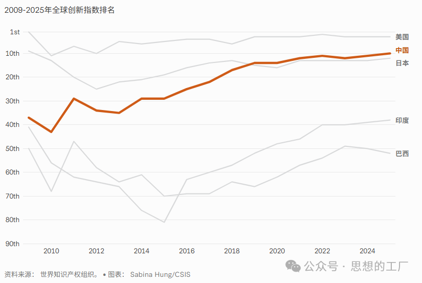 过去二十年间,中国在全球创新指数(GII)——这一衡量各国创新能力的权威指标——中的排名实现显著跃升。目前,在该指数追踪的139个经济体中,中国位列全球第十、亚太第三,仅次于新加坡与韩国,略高于日本。近十年来,中国与印度、巴西等其他主要发展中经济体的创新排名差距持续扩大。