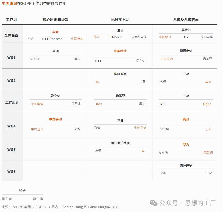 中国专家已从被动跟随者转变为积极主导者,在3GPP牵头负责的工作组数量超过其他所有国家。尽管担任工作组主席、副主席仅具备有限决策权,但这一变化清晰反映出国际社会的普遍共识:中国已成为众多关键技术领域不可或缺的核心参与方。