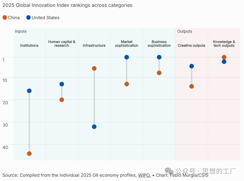 全球创新指数(Global Innovation Index, GII)是目前国际上最权威、最具影响力的衡量国家/经济体创新能力的年度指标,共设置78项细分指标,涵盖五大创新投入维度与两大产出维度。中国在各维度上的表现呈现明显分化:在基础设施、知识与技术产出方面领先美国;在商业成熟度、人力资本与研发投入、创意产出等维度略逊于美国;在市场成熟度及制度环境方面则与美国存在一定差距。