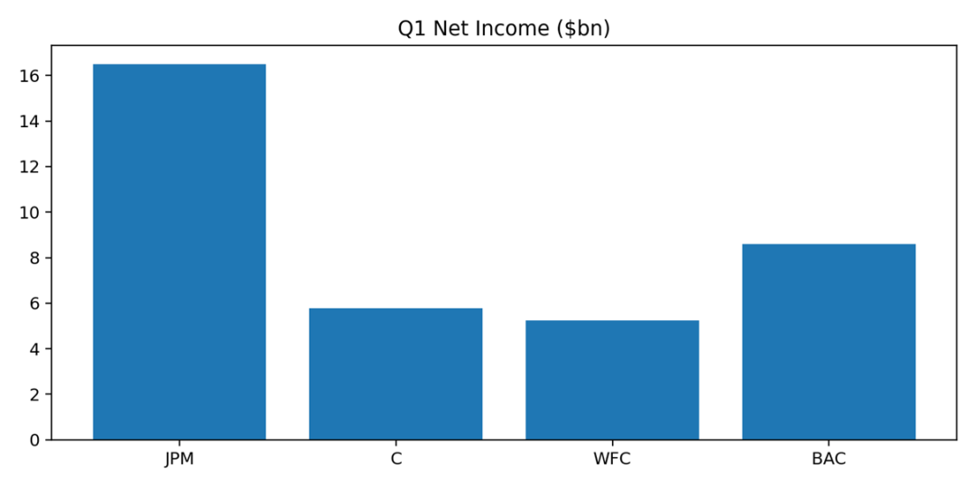 摩根大通一季度实现净收入约505亿美元,净利润164.9亿美元,摊薄EPS 5.94美元;其中NII达到255亿美元,同比增长9%。ROTCE为23%,继续维持在行业高水平。单看盈利能力和综合经营韧性,JPM依然是这一轮财报季里最稳的一家。
