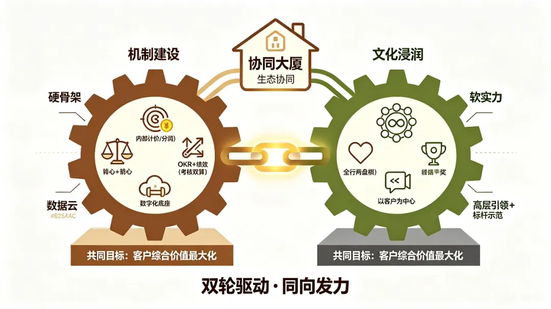 组织协同的落地,需要完善的机制建设作为硬支撑,从根源上破解“不愿协同、不能协同”的核心痛点;个体协同的激活,需要深厚的文化浸润作为软实力,解决“主动协同、全员协同”的内生动力问题。二者双轮驱动、深度融合,才能让生态协同真正从理念转化为经营实效。