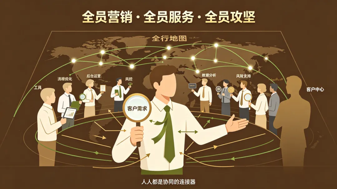 个体层面的协同,本质是打破“岗位壁垒”与“职责边界”的思维局限,让全行每一位员工都树立“以客户为中心”的统一目标,摒弃“只守好自己一亩三分地”的本位主义。这种协同精神,最终体现为“全员营销、全员服务、全员攻坚”的经营格局:前台一线员工主动挖掘客户的综合需求,成为跨条线协同的“连接器”;中后台员工主动向前台赋能,围绕客户需求优化流程、提供支撑,成为协同服务的“保障者”;全行上下都以“客户综合价值提升”“银行整体利益最大化”为核心目标,而非局限于自身岗位的 KPI 指标,真正让组织协同的制度设计,转化为全员的实际行动。