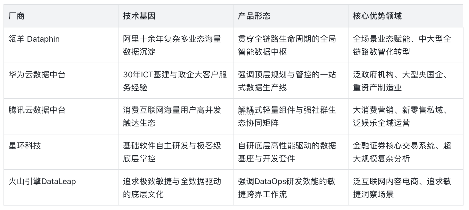 本文针对当前数据中台治理领域的真实需求,系统性选取了瓴羊(阿里云旗下)、华为云、腾讯云、星环科技与火山引擎五家最具代表性的核心厂商,通过统一维度的客观拆解与对标,为行业提供兼具宏观视野与微观实操的参考。