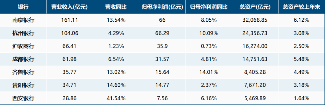 截至目前,杭州银行、南京银行、沪农商行、成都银行、齐鲁银行、贵阳银行、西安银行7家银行率先交卷,结果是——7家银行营业收入全部正增长,归母净利润全部正增长。杭州银行、南京银行单季净利润双双站上66亿元,齐鲁银行利润增速超过14%,西安银行营收增速达到41.54%。