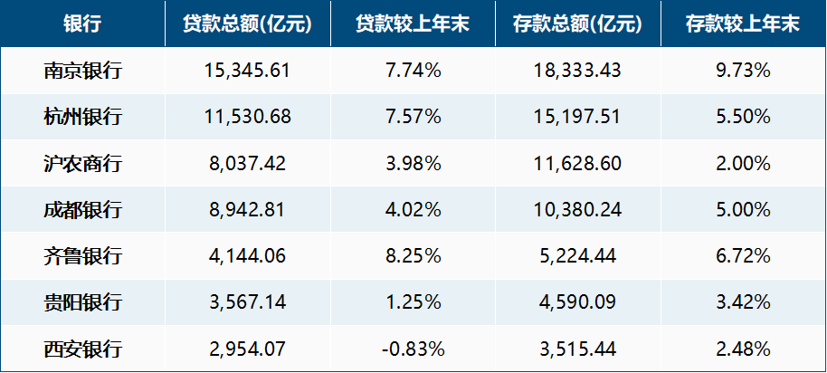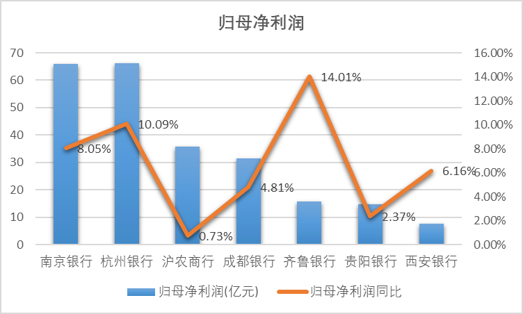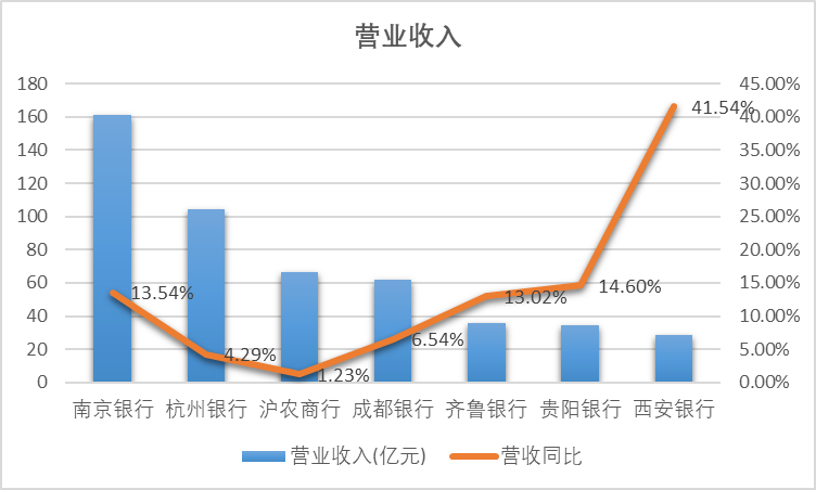 南京银行营业收入161.11亿元,同比增长13.54%;齐鲁银行增长13.02%;贵阳银行增长14.60%;成都银行增长6.54%;杭州银行增长4.29%。