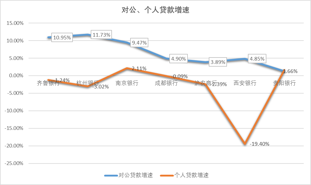 齐鲁银行一季度贷款总额增长8.25%,其中公司贷款增长10.95%,个人贷款反而下降1.24%。杭州银行公司贷款增长11.73%,而个人贷款下降3.02%。
