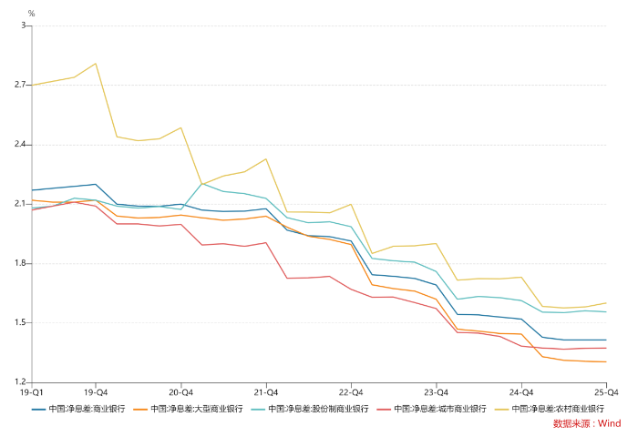 2019年底至2025年底,全国商业银行净息差由2.20%持续下滑至1.42%。分类型看,大型商业银行、股份制商业银行、城市商业银行、农村商业银行净息差分别由2.12%、2.12%、2.09%、2.81%降至1.30%、1.56%、1.37%、1.60%。无论是行业整体水平还是单类机构情况,六年时间,息差降幅基本在50-120基点区间(详见图1)。