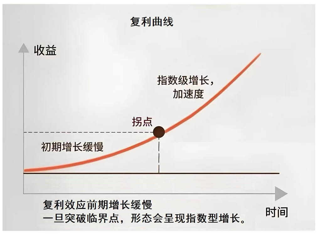 提高复利,相信大家首先想到的就是复利曲线(见附图),最关注的、也是最期盼的,就是那个神奇的"拐点"。投资学上的"拐点"一般是指收益开始显著加速、超越线性增长的阶段,也被称为"复利曲线开始变陡"或"复利效应真正显现"的临界点。