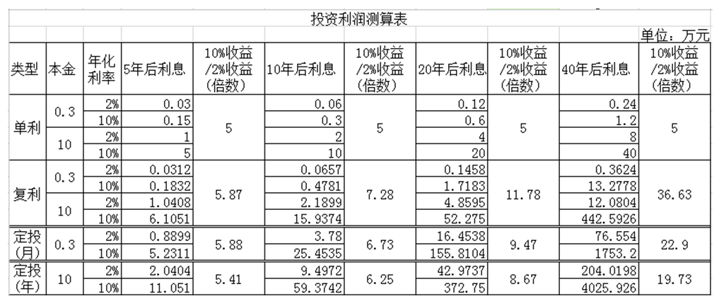 我们分别以本金3000元、10万元为例,对比一下投资在单利、复利、定投三种情况下,年化利率设定为2%和10%,投资5年、10年、20年、40年后的收益情况(见附表)。从表中可以看出,在本金较小(如3000元)的情况下,哪怕利率再高(如年化10%),前10年的复利收益(4781元)也并不大,40年后的收益也仅3624元,仅比单利收益高1224元。但如果将本金提高(如10万元),哪怕复利利率再低(如年化2%),10年后的收益也达到了21899元,40年后的收益为120804元,收益远高于前者。